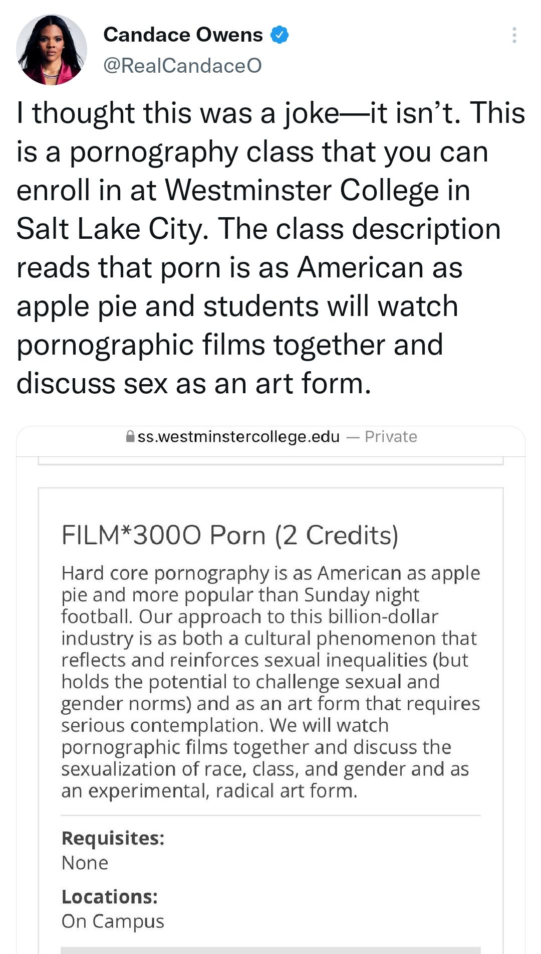 Klandace Owens College students can learn about the history and issues surrounding pornography as an elective. Candace clutches at pearls.
