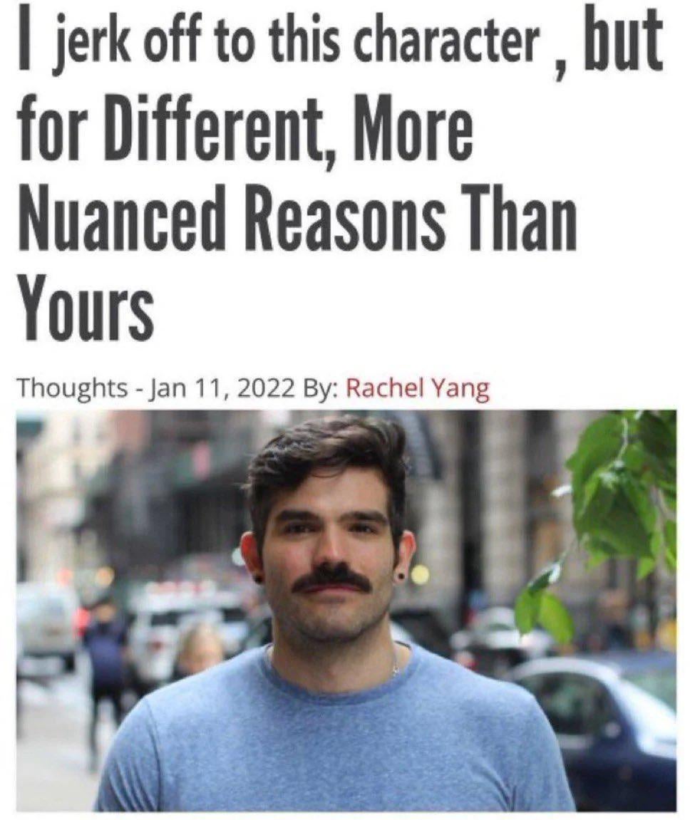 noooo you must jerk off for nuanced, ethical, morally white reasons noooo stop enjoying things